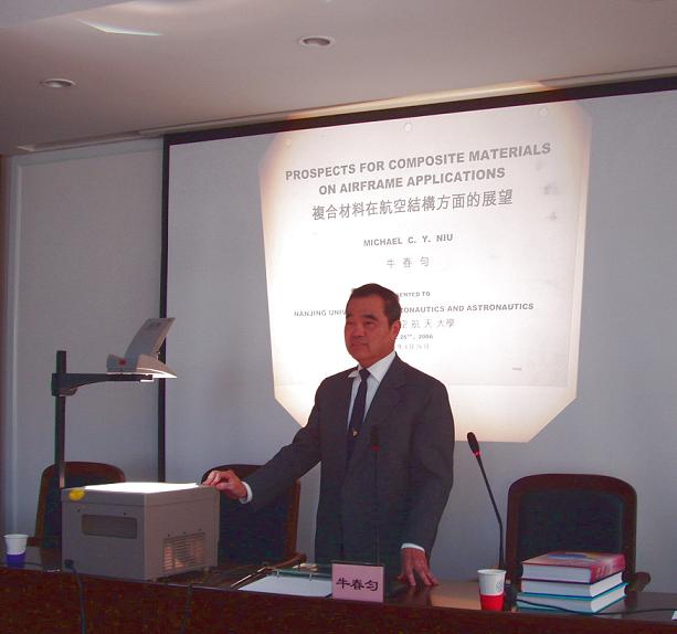 2006年4月27日上午,艾笛航空结构顾问公司总经理、公司客座教授牛春匀教授,在航空宇航公司报告厅,作了题为“复合材料在航空结构方面的展望”的精彩学术报告。报告会由航空宇航公司副经理赵宁教授主持,参加报告会的还有前董事长朱剑英教授及航空宇航公司师生近两百人。