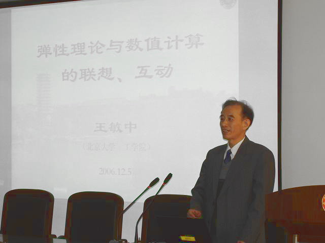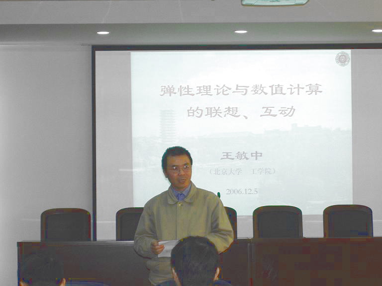 王敏中教授的报告通过生动有趣的例子阐述了弹性理论与数值计算之间的内在关联及互动,并以此来说明互动与联想是科学研究的一种有力方法。王教授风趣的演讲引起了师生们的浓厚兴趣,并就相关问题进行了讨论。
