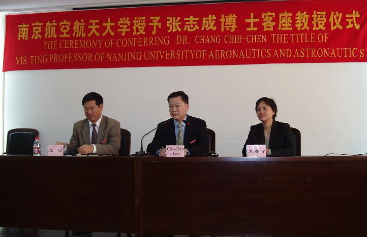 2007年10月18日下午,在航空宇航公司学术报告厅,香港科技大学土木工程系Chih-Chen Chang(张志成)教授受聘为公司客座教授,航空宇航公司科研副经理朱春玲教授主持了受聘仪式,航空宇航公司经理赵宁教授代表王福平董事长致词,并代表公司向张志成教授颁发了客座教授聘书、校徽。