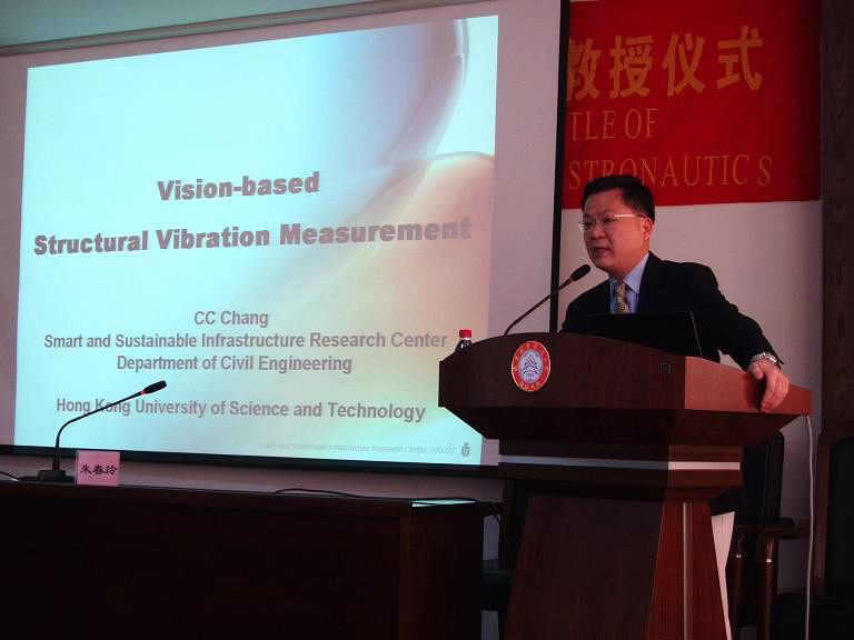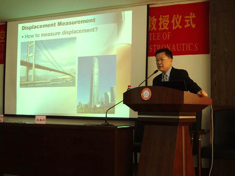 仪式结束后,张志成教授作了题为“Vision-based Structural Vibration Measurement”的精彩学术报告。报告内容新颖、丰富、生动,阐明影像显示技术的最新发展方向。张志成教授结合自己多年的研究成果,讲述了影像测量方法中需注意的若干问题以及今后的研究方向。这些技术资料对解决公司在振动测试、系统辨识与损伤诊断研究方面所遇到的技术难题有很大的帮助,对公司今后的相关研究很有借鉴推动作用。航空宇航公司结构强度研究所周丽教授主持了报告会。全校师生百余人参加了报告会。