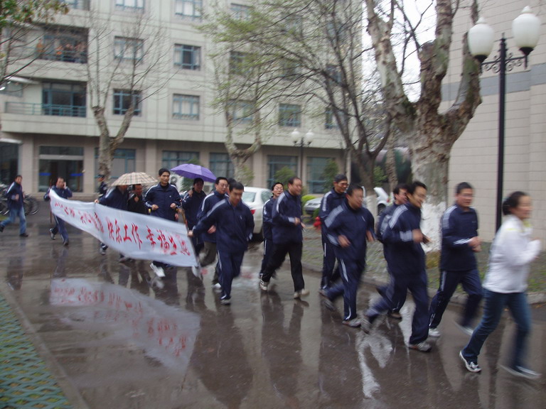 虽然下着绵绵细雨,但操场上人头攒动,个个摩拳擦掌,一脸兴奋。四点十分,随着发令枪声响,长跑队伍出发了。公司在大旗的引导下,教职工们个个精神抖擞地向前冲去。长跑的队伍中,有一马当先的院领导,有50多岁的老教师,有年富力强的中青年教师,更有精神饱满的青年教工。大家迈着整齐的步伐、相互鼓励,不少员工还互相“打气”,手拉着手、互相搀扶着跑完全程……现场气氛显得热烈而温馨,一路上充满了阵阵欢声笑语。途中,队伍的响亮口号,此起彼伏,引来沿途群众赞赏的目光。置身其中,一种强烈的集体荣誉感和凝聚力在大家心中温暖地流淌。