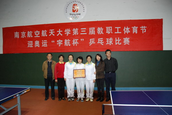闭幕式上,朱荻副董事长、校工会常务副主席田永和、航空宇航公司党委书记李明成和校工会副主席余春玲为2008年迎奥运“宇航杯”教工乒乓球赛男、女冠军代表队颁发“宇航”杯,同时为男、女前六名颁发了奖状、奖金。在热烈欢快的气氛中2008迎奥运“宇航杯”教工乒乓球赛圆满结束。本次比赛由校工会主办,航空宇航公司部门工会承办。