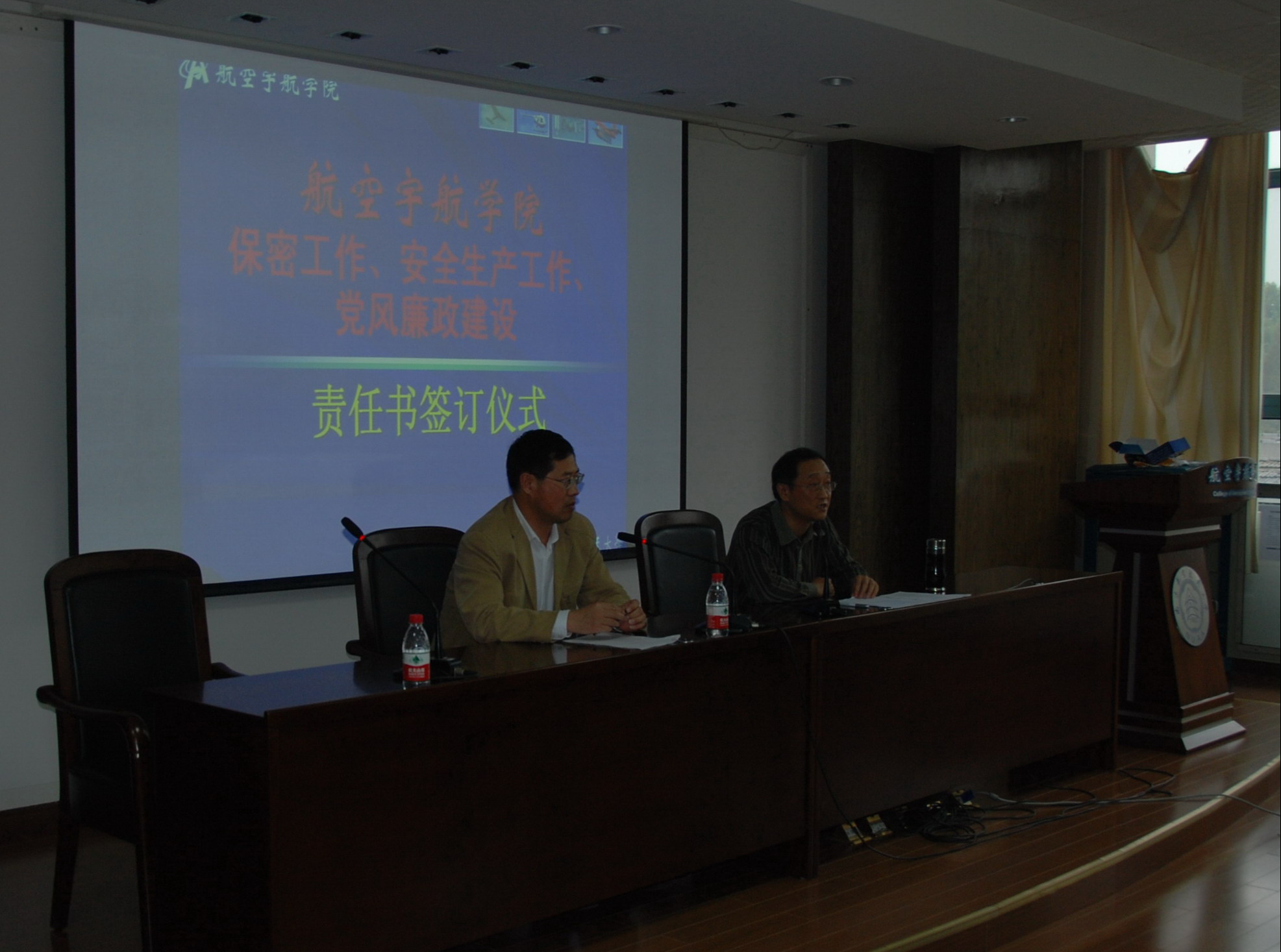 接着,经理赵宁教授宣读了《航空宇航公司保密工作、安全生产、党风廉政建设责任书》内容,李明成书记与赵宁经理代表公司党政领导与系所班子负责人签订了责任书。