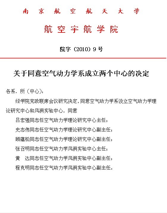 关于同意空气动力学系成立两个中心的决定