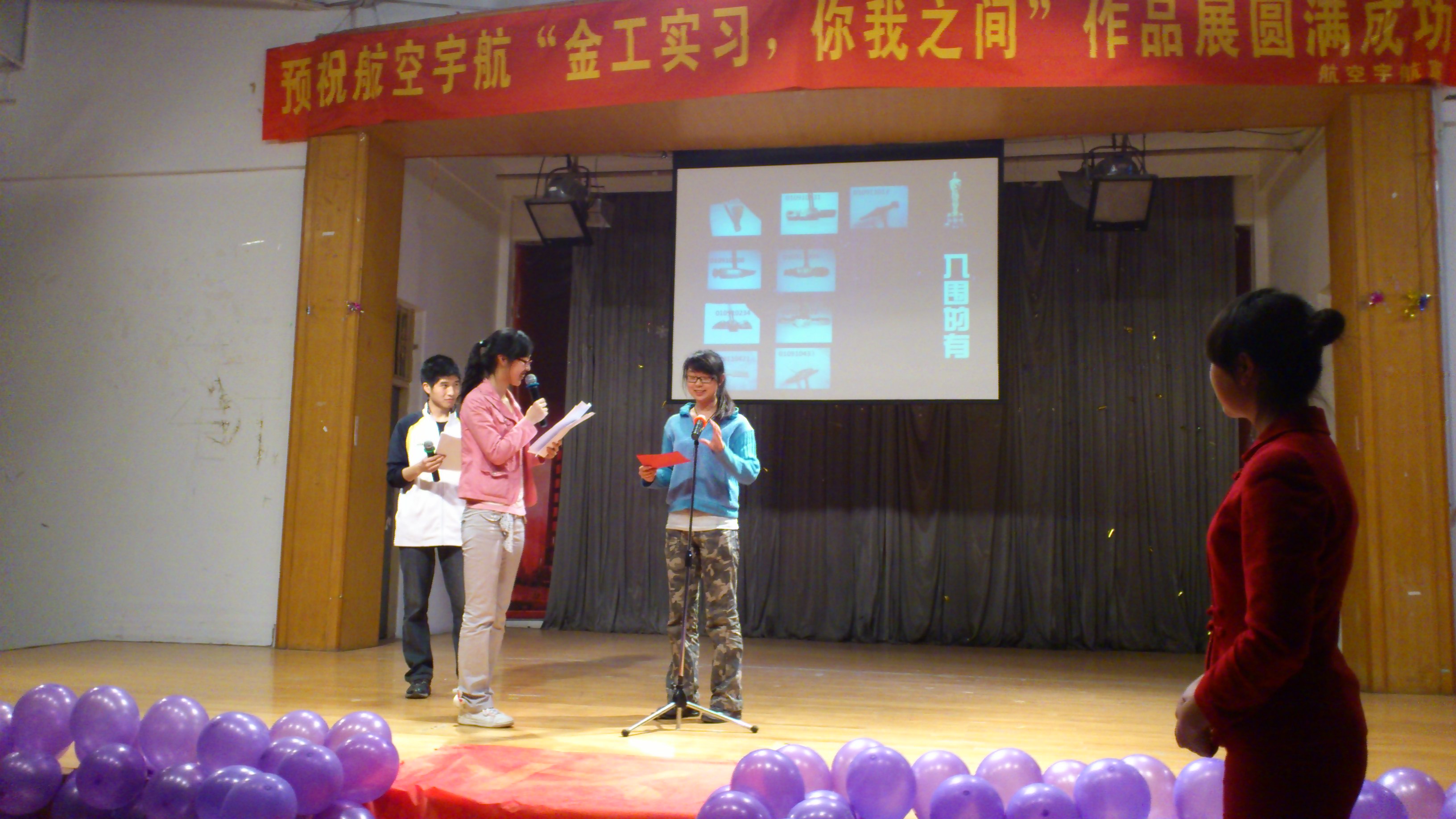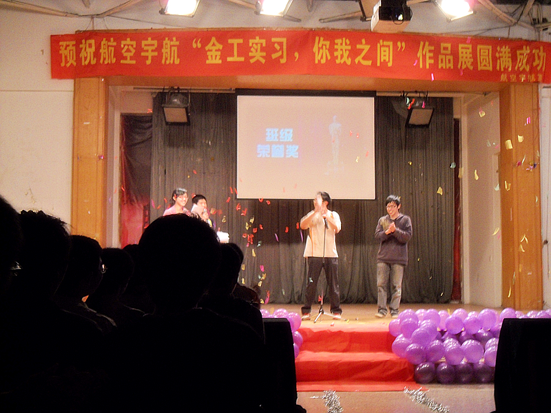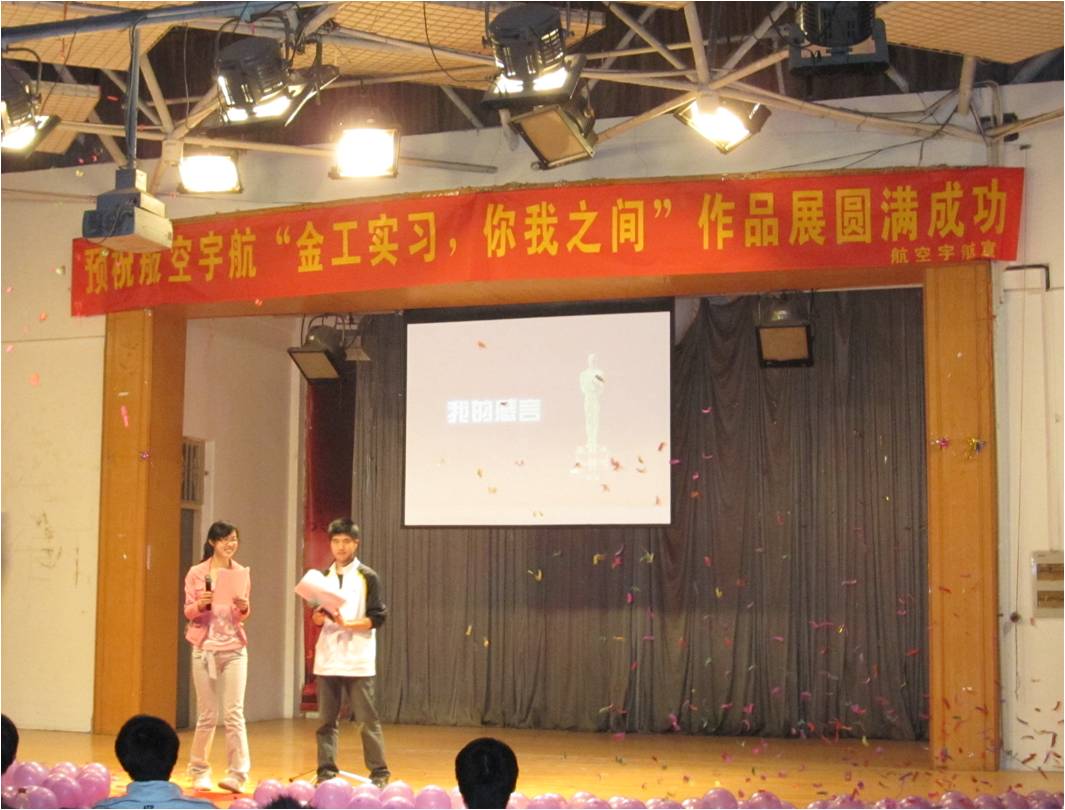 在闪着“金工奥斯卡”字幕的屏幕、激昂的音乐下,颁奖晚会正式开始。首先,姜文骏主席代表院员工会对为此次活动做出重要贡献各部门表示高度赞扬并向他们致以由衷的谢意。接下来他以一个过来人的身份与大家聊起了金工实习的点滴,与大家一同分享,幽默的话语中满含着对那段“蓝领”时光的怀念。接下来在播放由“新空间”做的金工实习期间各班照片集锦时,观众席上讨论声、笑声此起彼伏,随着一组搞笑照片的依次展出,整场晚会被推向了高潮:颁奖。