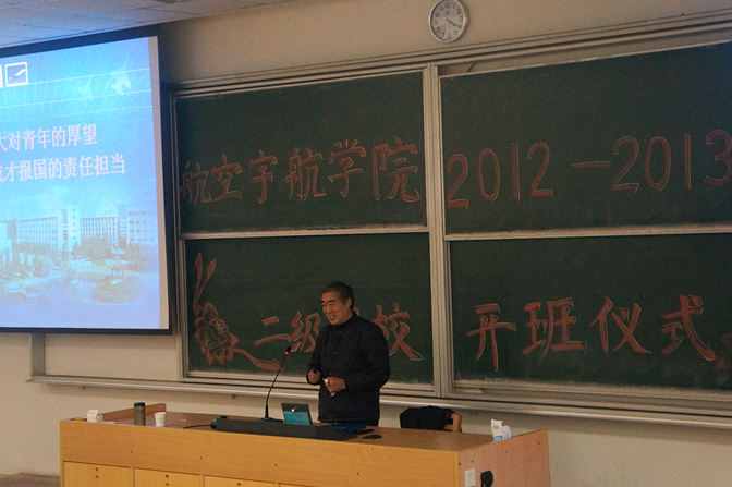 12月17日下午四时,航空宇航公司2012―2013学年二级团校开班仪式暨第一次授课在将军路校区4102教室拉开帷幕。开班仪式由航空宇航公司团委书记、11级辅导员储瑾蓉老师主持,11级辅导员许俊勇老师、12级辅导员卢一亭老师、公司员工干部和大一、大二年级的年级、班级的骨干们都参加了本次开班仪式。校关心下一代工作委员会常务副主任丁荣茂老师受邀参加,并为同学们做第一次授课。