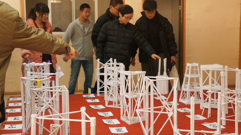 经过前期的预赛比拼,共有三十支队伍近百人进入决赛,开赛后主持人首先介绍了比赛的流程及规则。赛中第一轮就出现了高水平作品,B组第一个作品承重超过200公斤,经过3个小时的激烈角逐,“土木之队”等15支队伍分别斩获了特、一、二、三等奖,其他队伍也分别获得了造型风采、结构创新等优胜奖。“六芒星”团队的作品获得“最佳承重奖”,承重达300公斤。