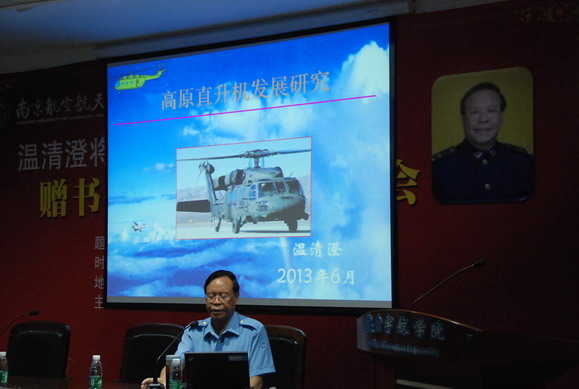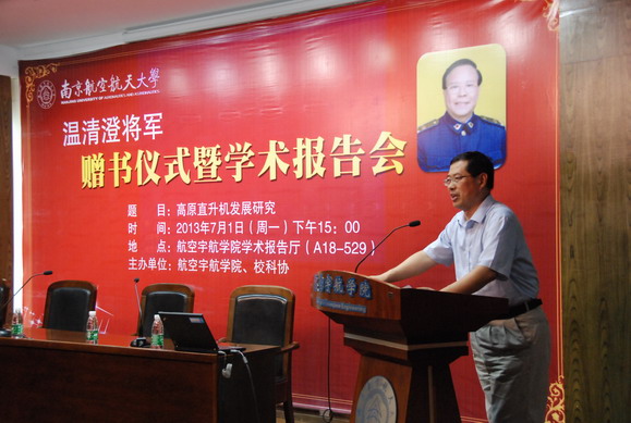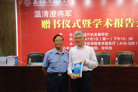 2013年7月1日下午在18号楼529报告厅,举办了总参陆航部原装备发展办公室总师温清澄将军新书赠书仪式和学术报告会。宣益民副董事长、赵宁经理、直升机旋翼动力学重点实验室及全校师生150多人参加了相关活动。