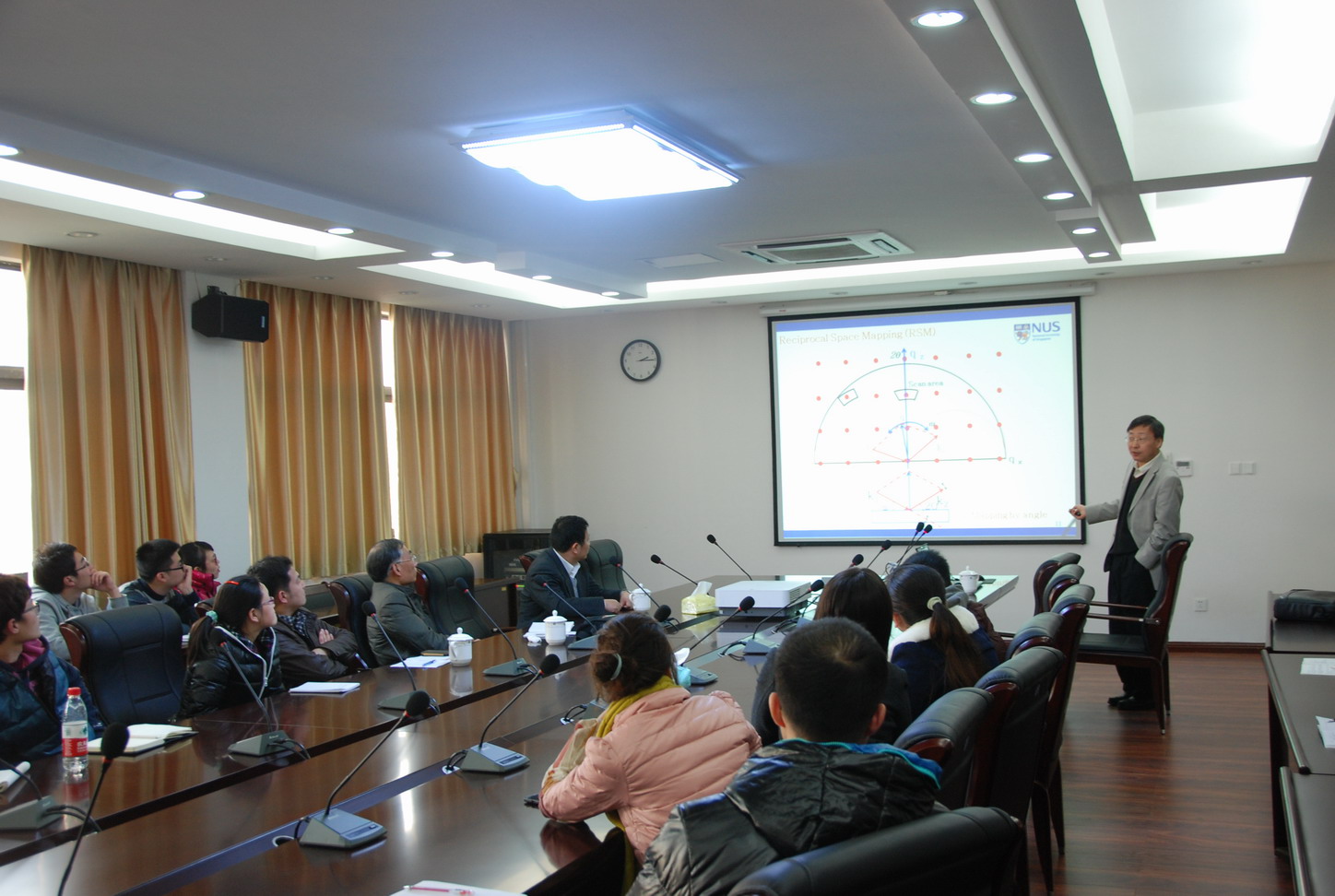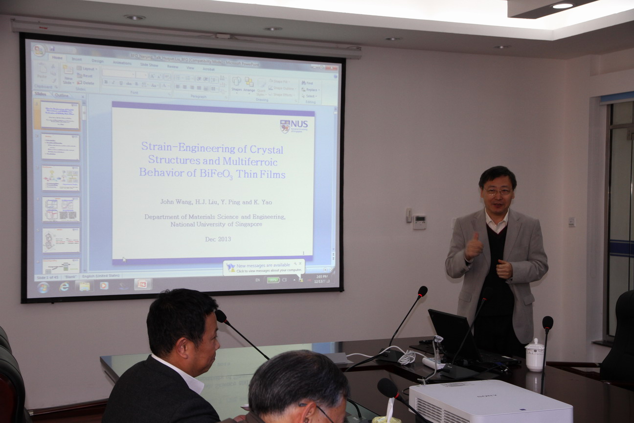 访问期间John Wang教授做了题为“Strain-Engineering of Crystal Structures and Multiferroic Behavior of BiFeO3 Thin Films”的学术报告。报告介绍了铁酸铋薄膜的最新进展,并讨论了在铁电、压电以及能源材料等领域的合作交流等。报告结束后,现场老师和员工就报告内容进行了积极讨论。John Wang教授还参观了还参观了公司“机械结构力学及控制”国家重点实验室。