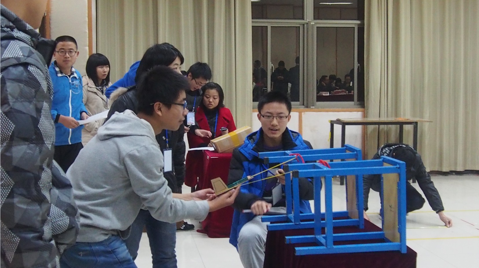本次比赛吸引近450名员工报名参加。6日晚,各院13级70组参赛选手提前到达会场。他们紧张地试飞,对飞机做最后的微调。比赛正式开始后,每组参赛选手向评委老师介绍自己的团队作品,仔细讲解作品的设计理念与结构,并认真回答评委老师的提问。随后选手使用弹射装置弹射飞机,由工作人员测出飞机滑翔距离和偏航距离。比赛如火如荼地进行,有成功的击掌,也有失败的鼓励。
