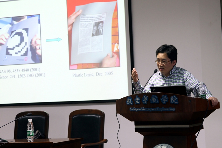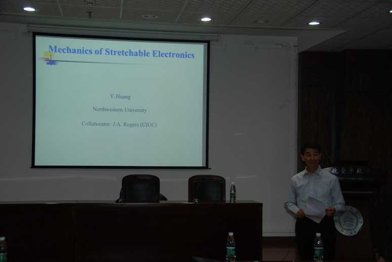 访问期间,做了题为“Mechanics of Stretchable Electronics”的学术报告。介绍了力学和材料在集成电路方面的最新进展,特别是其中柔性材料的发展和应用。最后,他总结道:“The future is Mechanics”。郭万林教授主持了报告会。