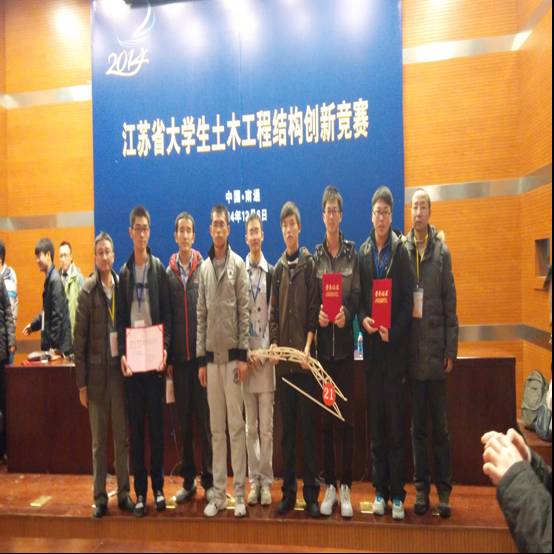 本次本赛包括,现场模型制作与加载组和模型展示组。由曹天宝、覃冬衡、徐争佳同学组成队伍在现场模型制作与加载竞赛中以加载总重第一、综合第二的成绩获得特等奖。模型展示组竞赛中,由赵培智、李冲、孙玉龙同学制作的作品“3D时代”获得三等奖,另由范周伟、张子豪、倪博文同学制作的作品“魔鬼的爪牙”获优胜奖。通过比赛和交流,同学们加强了结构设计和制造的理念,锻炼了设计、动手、表达等方面的综合能力。