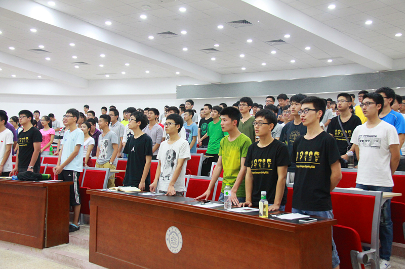 仪式开始时,全体同学起立共唱校歌为出征仪式造势。王宁老师随后向大家展示了航空宇航公司暑期社会实践logo、队旗和队服,并对实践前期的准备工作、后期宣传工作进行了讲解。