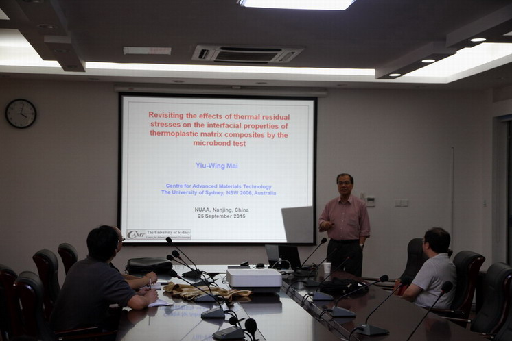 应公司机械结构力学及控制国家重点实验室高存法教授邀请,澳大利亚悉尼大学教授、澳大利亚联邦杰出学者、澳大利亚科公司和工程院两院院士、英国皇家学会外籍院士Yiu-Wing Mai(米耀荣)教授于2015年9月23日至26日访问了公司,并于9月25日为公司师生做题为“Revisiting the effects of thermal residual stresses on the interfacial properties of thermoplastics composites by microbond test”的学术报告。报告内容丰富、生动、精彩,综述了残余热应力对复合材料界面性能的效应,对公司相关科研工作具有借鉴作用。王立峰教授主持了此次报告。