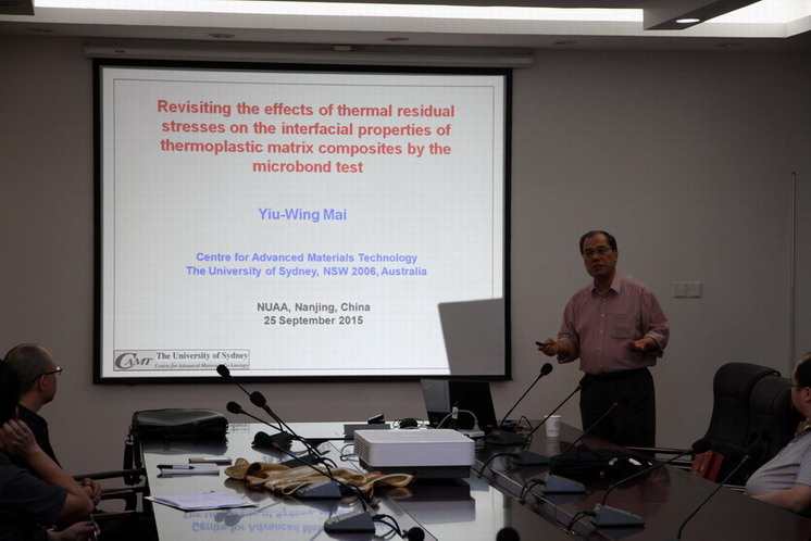 应公司机械结构力学及控制国家重点实验室高存法教授邀请,澳大利亚悉尼大学教授、澳大利亚联邦杰出学者、澳大利亚科公司和工程院两院院士、英国皇家学会外籍院士Yiu-Wing Mai(米耀荣)教授于2015年9月23日至26日访问了公司,并于9月25日为公司师生做题为“Revisiting the effects of thermal residual stresses on the interfacial properties of thermoplastics composites by microbond test”的学术报告。报告内容丰富、生动、精彩,综述了残余热应力对复合材料界面性能的效应,对公司相关科研工作具有借鉴作用。王立峰教授主持了此次报告。