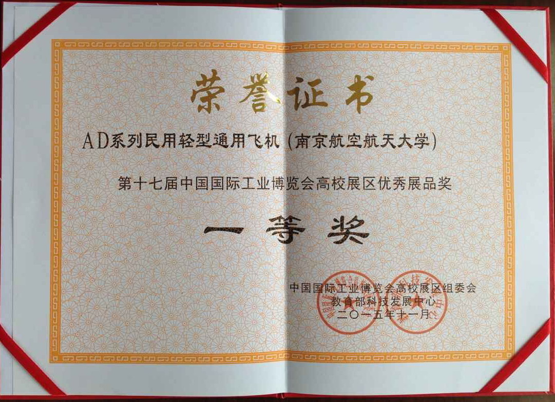 2015年11月3日至7日,第十七届中国国际工业博览会(以下简称“工博会”)在上海新国际博览中心举行。公司在本届工博会上取得喜人成绩,航空宇航公司组织推荐的“AD系列民用轻型通用飞机”项目荣获大会高校展区优秀展品一等奖,科技部刘华翔获得高校展区先进个人奖。