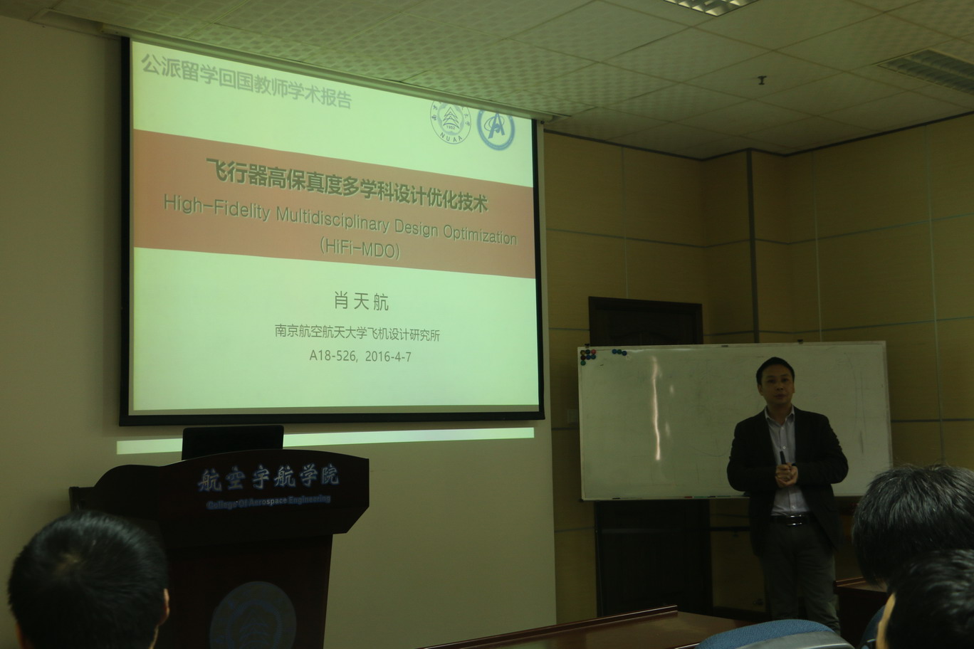 按照校人事处关于公派留学回国教师的要求,航空宇航公司飞行器系肖天航副教授于2016年4月7日为公司师生作了题为“飞行器高保真度多学科设计优化技术”的学术报告。报告总结了其在留学期间所开展的气动数值模拟方法方面的研究工作;结合国际发展动态,介绍和评述了飞行器高保真度多学科设计优化技术及研究现状、面临的挑战和发展趋势。
