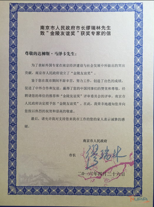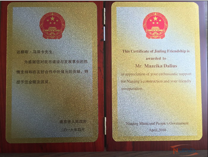 公司客座教授Dalius Mazeika荣获2016年度“金陵友谊奖”