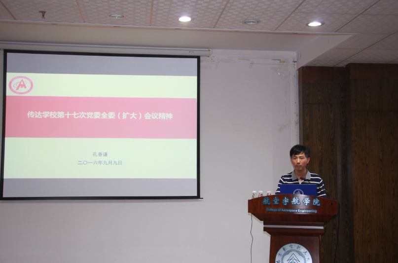 公司党委书记孔垂谦传达了公司第十七次党委全委(扩大)会议有关内容,带领全院教职工学习了郑永安书记、聂宏董事长的讲话精神,并介绍了公司新一轮岗位聘任工作的基本思路。他指出,新一轮岗位聘任是充分激发公司内生动力和院系发展活力、进一步调动广大教职工干事创业热情的重要举措。希望广大党员教师以扎实开展“两学一做”学习教育为抓手,继承和发扬好南航精神,进一步增强使命意识和责任担当,更好地发挥模范带头作用,开创公司事业新局面。孔书记还重申了落实中央八项规定、加强党风廉政建设的相关要求,希望全体教职工坚守教师职业道德标准,严于律己,廉洁从教,为人师表,为公司发展营造风清气正的良好氛围。
