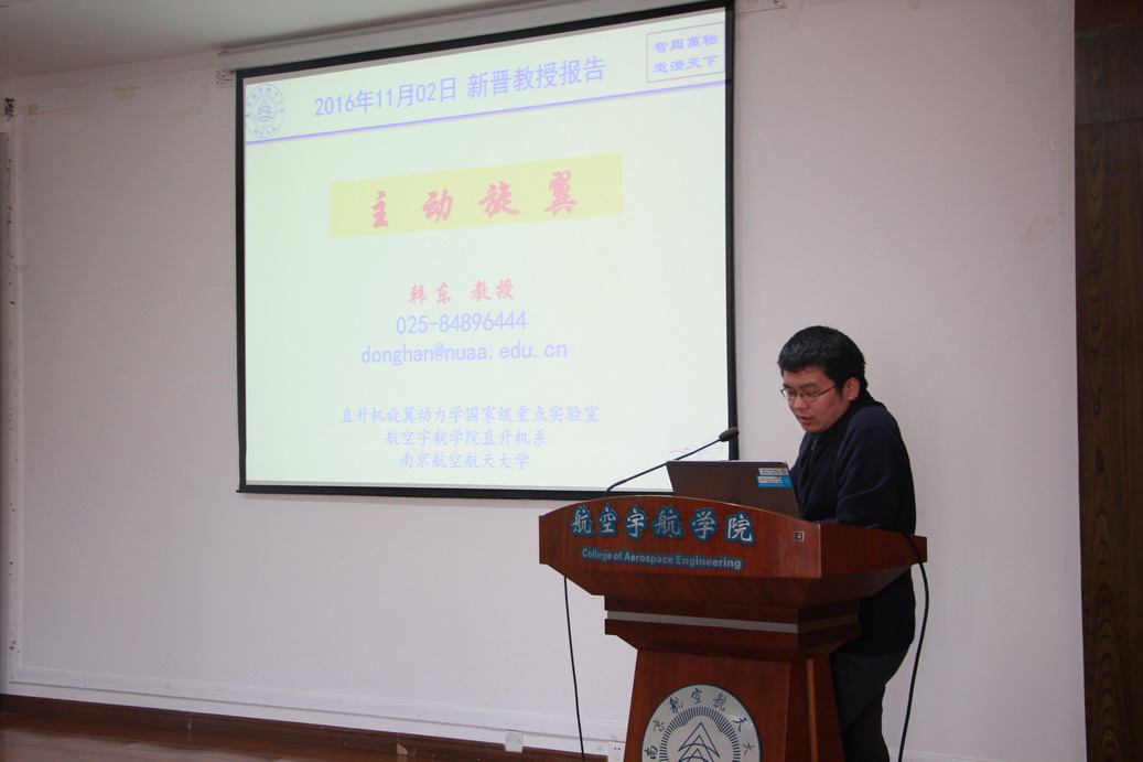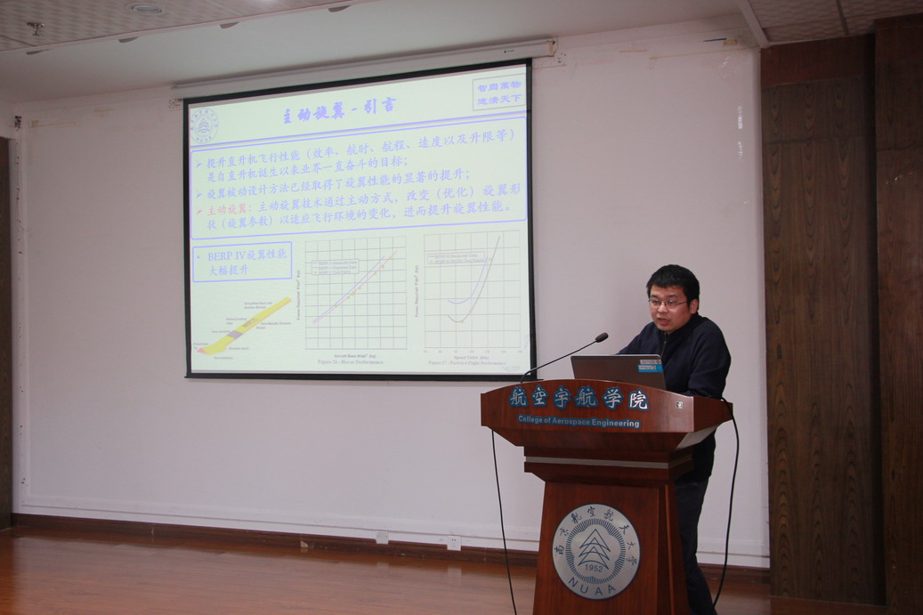 2016年11月2日上午,公司航空宇航公司直升机旋翼动力学国家级重点实验室韩东教授受邀做客“青年教授讲坛”,在18号楼529报告厅做了题为“主动旋翼”的学术报告。航空宇航公司李建波研究员主持了报告会,参加此次报告会的主要是来自全校相关专业的教师及员工。