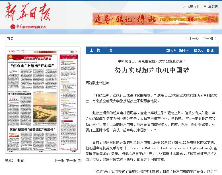 新华日报:中科院院士、南航教授赵淳生:努力实现超声电机中国梦