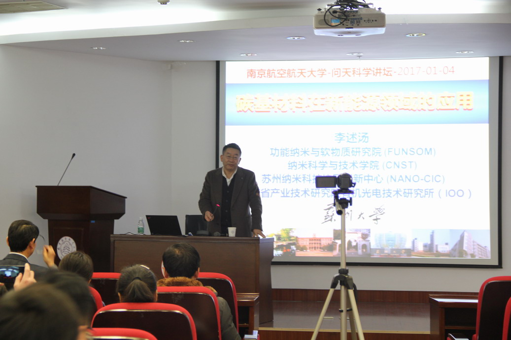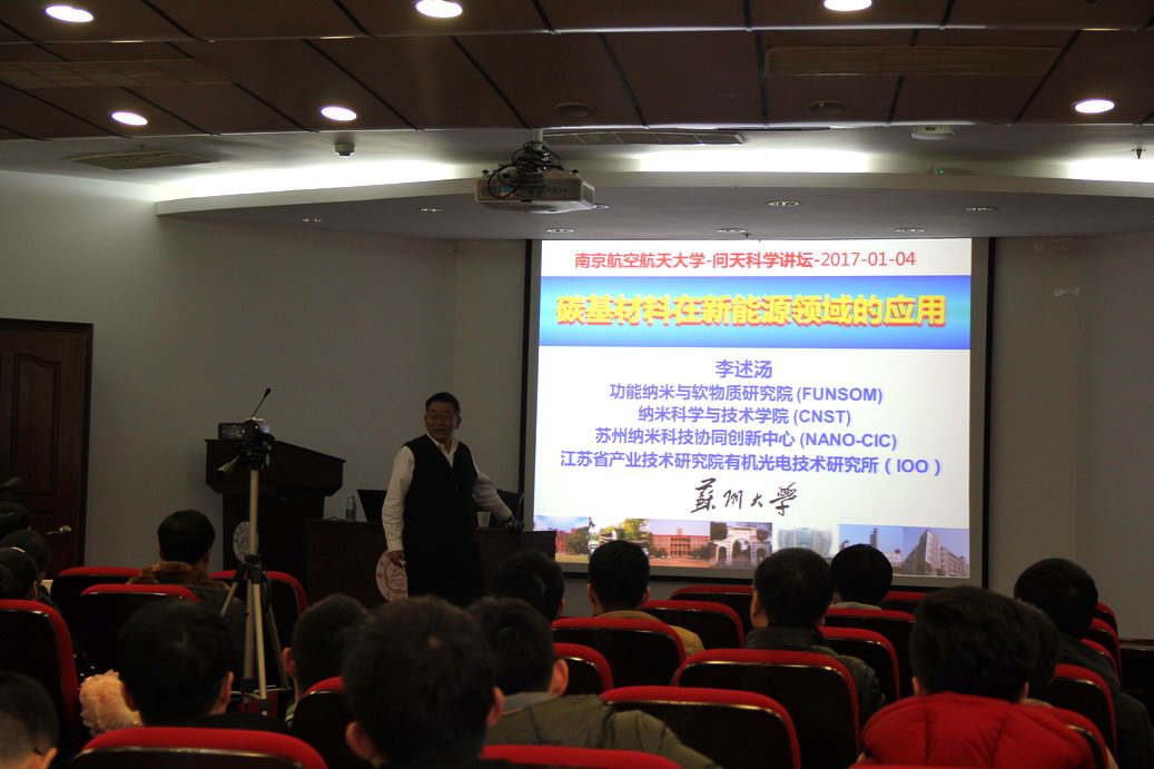应公司机械结构力学及控制国家重点实验室郭万林教授邀请,材料学家、中国科公司院士、苏州大学李述汤教授于2017年1月4日至5日访问了公司,并于1月4日为公司师生做了题为“碳基材料在新能源领域的应用”的学术报告。李述汤院士讲述了他做有机白光OLED照明的历程,从最初的动机到如何克服一个个的困难,到最后做出在全世界领先的产品。报告会上,李院士激情澎湃、斗志昂扬的精神深深激励了在座的师生。郭万林教授主持了报告会。