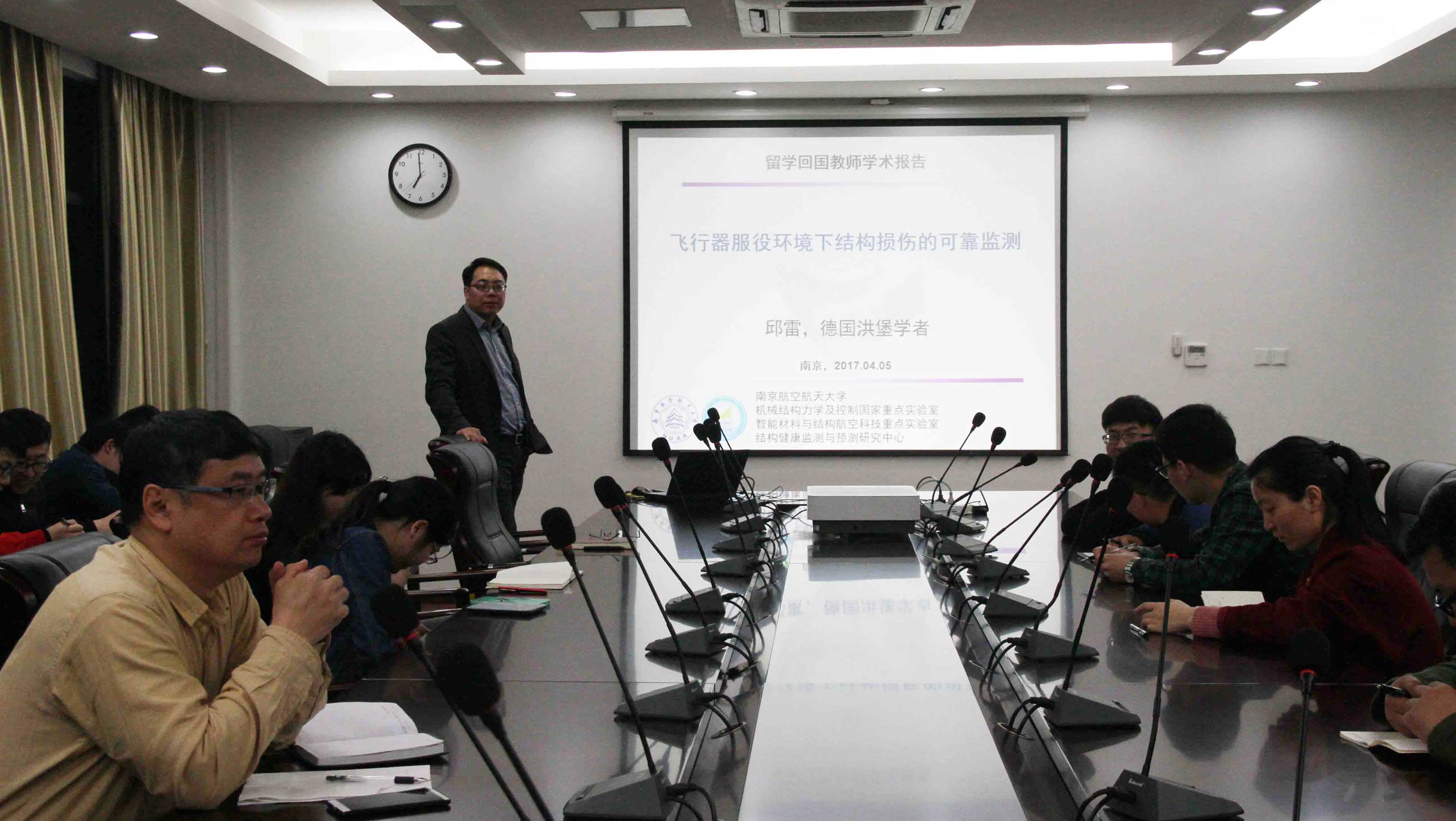 按照校人事处公派留学回国教师的要求,航空宇航公司机械结构力学及控制国家重点实验室邱雷副教授于2017年4月5日为公司师生做了题为“飞行器服役环境下结构损伤的可靠监测”的学术报告。报告介绍了其在德国萨尔布吕肯大学(Saarland University)弗劳恩霍夫无损检测研究所(Fraunhofer IZFP)访问期间所开展的结构健康监测导波的多物理场耦合建模仿真方法和导波受时变环境影响规律的概率混合建模方法的相关研究工作。