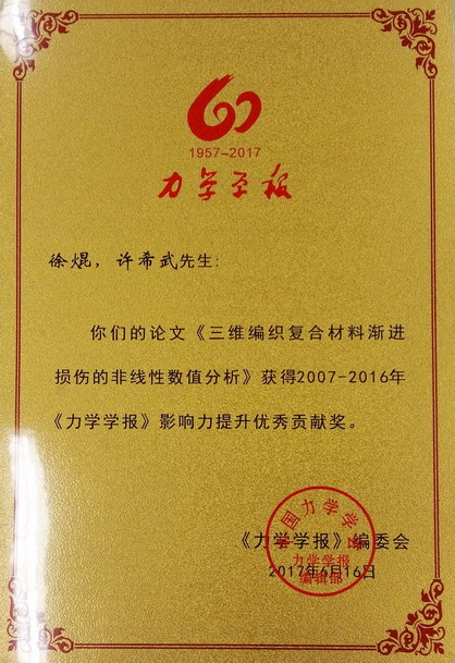 许希武教授论文获《力学学报》影响力提升优秀贡献奖