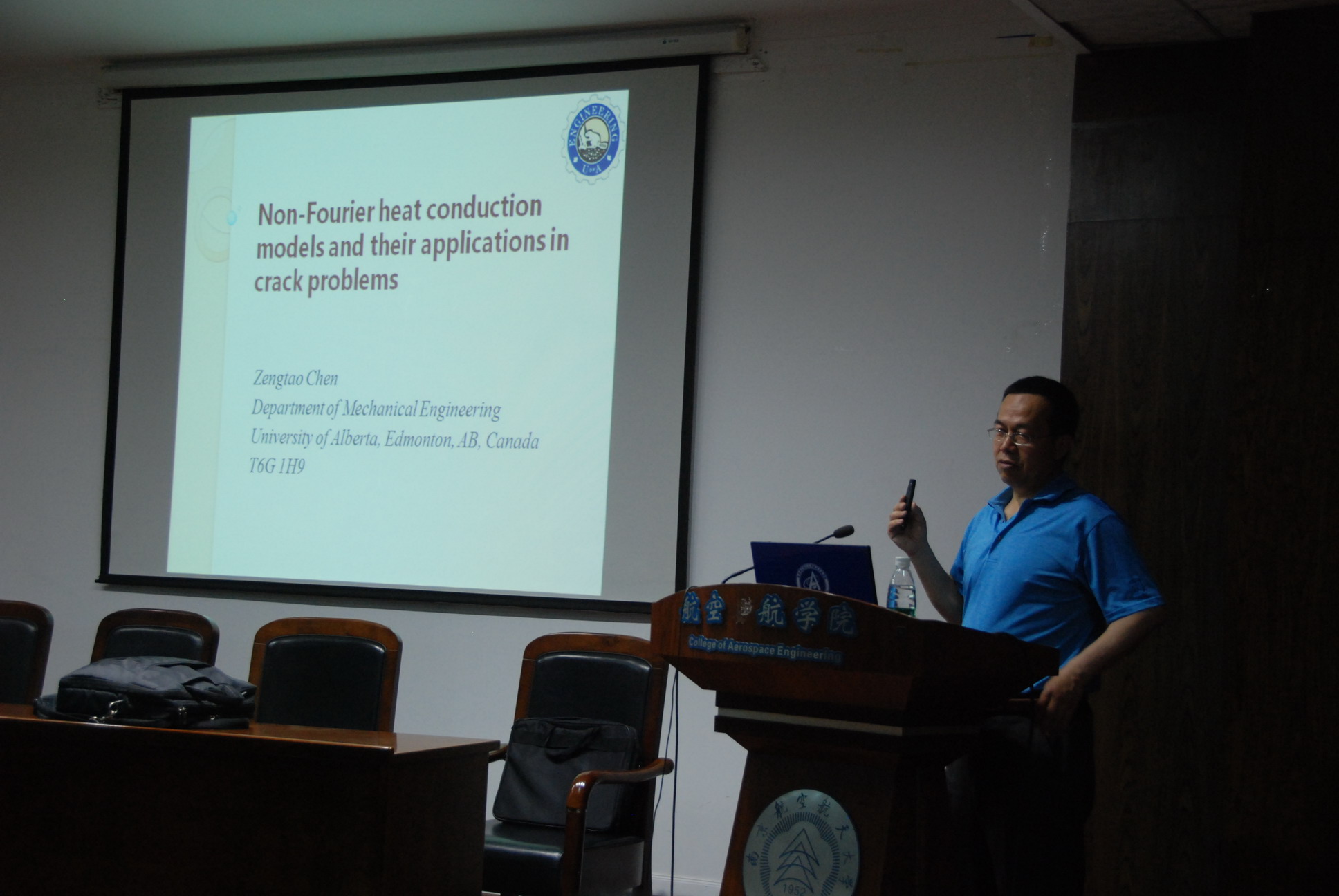 应公司航空宇航公司机械结构力学及控制国家重点实验室高存法教授邀请,加拿大阿尔伯塔大学陈增涛教授于2017年7月1日至5日访问了公司,并于7月4日为公司师生做了题为“非Fourier 热传导理论及在断裂力学中的应用”的学术报告。报告内容丰富、生动、精彩,介绍了固体热传导问题的