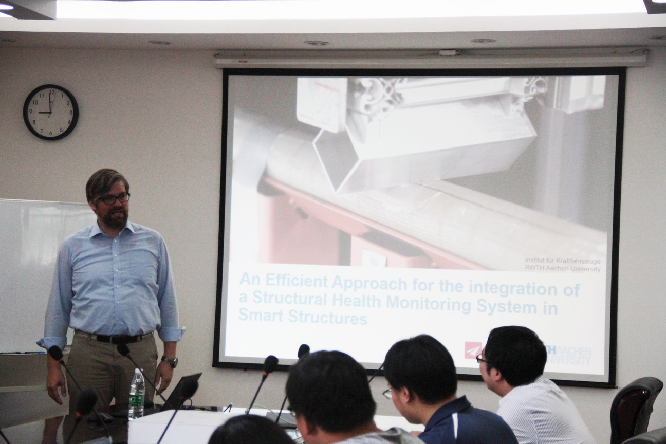 应公司机械结构力学及控制国家重点实验室邱雷教授邀请,德国亚琛工业大学Schröder教授于2017年8月20日至21日来公司学术访问,并于8月21日为公司师生做题为“An Efficient Approach for the integration of a Structural Health Monitoring System in Smart Structures”的学术报告。航空宇航公司邱雷教授主持了此次报告。