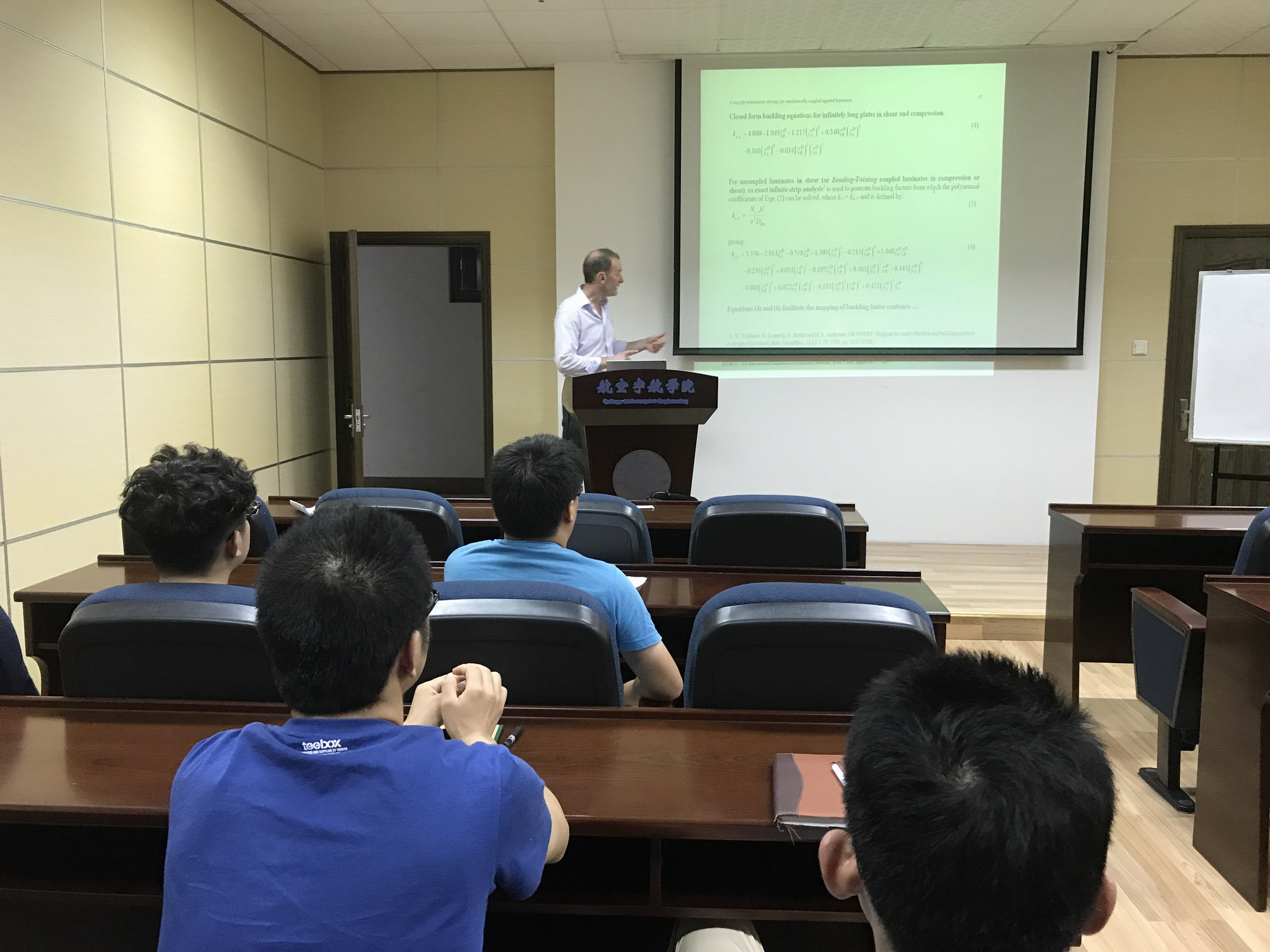 应公司航空宇航公司航空航天交叉研究院郭玉杰老师邀请,英国格拉斯哥大学Christopher Bronn York副教授,于2017年8月21日至9月1日访问了公司,并于8月30日为公司师生做了题为“Effect of bending-twisting coupling on the compression and shear buckling strength of infinitely long plates”的学术报告。报告内容丰富、生动、精彩,介绍了复合材料结构设计中的前沿研究工作,对公司相关科研工作具有借鉴作用。同时,Christopher Bronn York副教授还结合自己多年的研究经历,讲述了复合材料以及复合材料制造技术的发展历史等。郭玉杰老师主持了此次报告会。