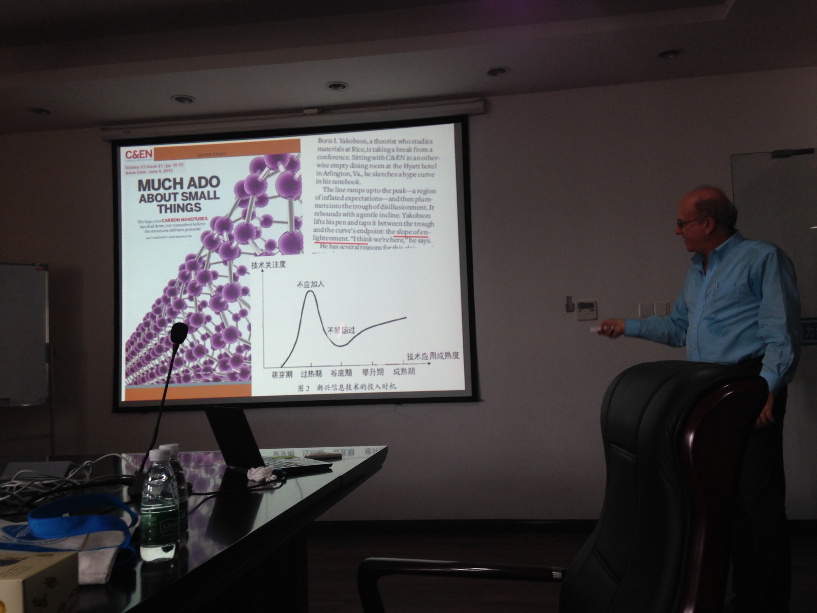 应公司航空宇航公司机械结构力学及控制国家重点实验室张助华教授邀请,美国莱斯大学材料科学与纳米工程系讲席教授Boris I. Yakobson于2017年9月5日至8日访问了公司,并于9月6日上午为公司师生做了题为“Predictive modeling of 2D materials, synthesis to properties”的学术报告。报告介绍了碳纳米结构的力学性质,生长机制以及二维硼单层结构与物性等研究方面的最新前沿进展,内容丰富、生动、精彩,对公司相关科研工作具有借鉴作用。同时,Boris I. Yakobson博士还结合自己多年的研究经历,讲述了自己在低维材料的理论计算与模拟方面的研究体会,分享了研究心得。公司长江学者特聘教授郭万林主持了此次报告会。