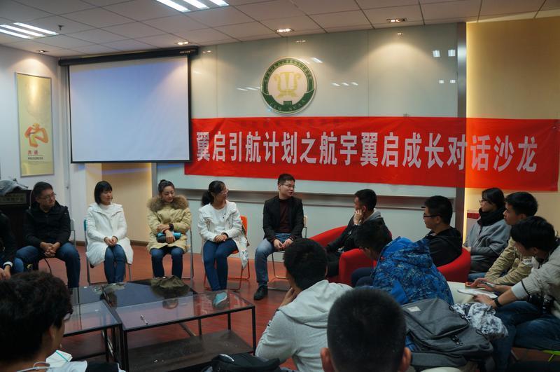 2017年11月17日晚,航空宇航公司首期“航宇翼启成长对话沙龙”在经管楼501会议室成功举行。首期沙龙邀请到了公司11级本科生、15级硕士生、中国老员工十大年度人物黄鸣阳,与17级新生分享他成长中的故事,讲述他如何从一个“科研小白”蜕变为如今的“科创大佬”,活动报名一上线,5分钟内名额就被一抢而空。