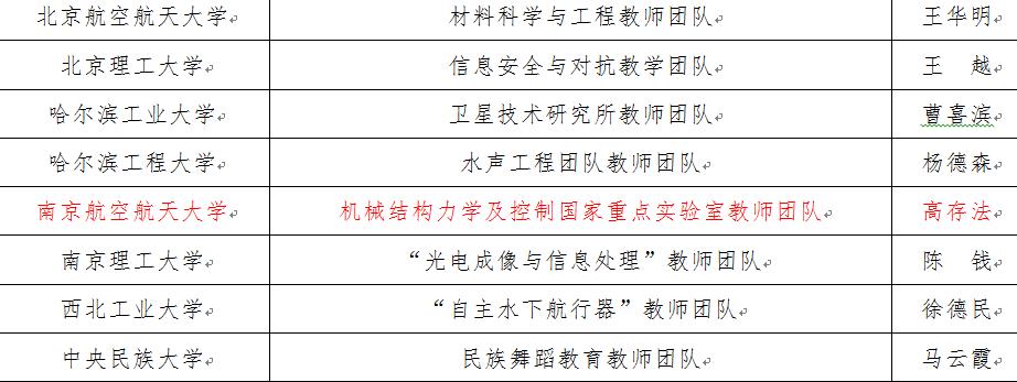 2017年12月20日,教育部公示“全国高校黄大年式教师团队”认定结果,航空宇航公司机械结构力学及控制国家重点实验室教师团队成功入选。
