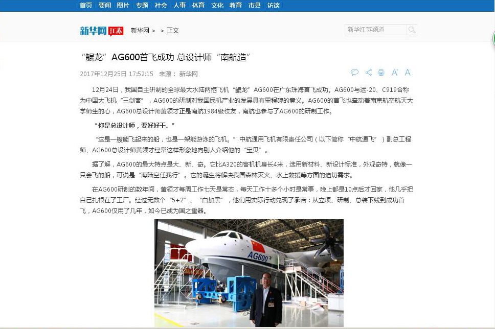 新华网:“鲲龙”AG600首飞成功总设计师“南航造”
