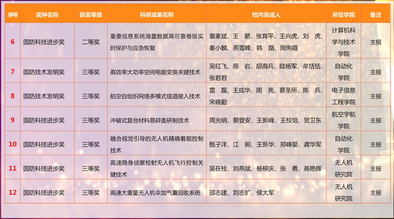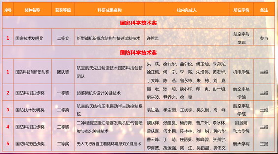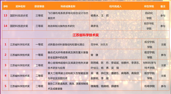航空宇航公司范华林教授等申报的“点阵复合材料装备结构轻量化理论”获江苏省科学技术一等奖,航空宇航公司曾捷副教授等参与的“融合式光纤传感系统及其在重大装备安全监测中的应用”获江苏省科学技术一等奖。