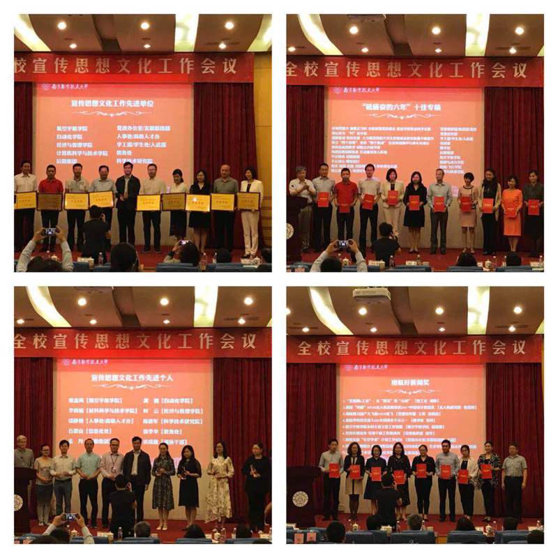 会上,公司对宣传思想文化工作的先进单位和个人颁奖。公司荣获2016-2018年度宣传思想文化工作先进单位(全校10个单位),张金凤老师荣获宣传思想文化工作先进个人(全校10人),《牢记使命,创新超越》荣获“喜迎党代会·砥砺奋进的六年”十佳专稿(全校10篇),储瑾蓉老师的《航空宇航公司本科生班主任工作剪影》荣获南航好新闻奖(全校15篇)。在本次表彰中,公司囊括了所有奖项。