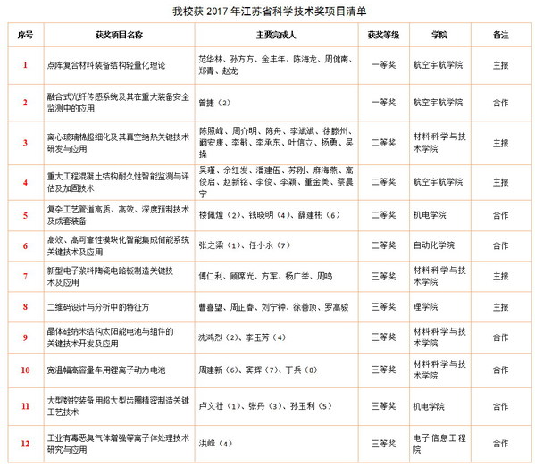公司共获2017年江苏省科学技术奖12项(一等奖2项,二等奖4项,三等奖6项),是历年来获江苏省科学技术奖最多的一年。一院范华林教授等申报的“点阵复合材料装备结构轻量化理论”获江苏省科学技术一等奖,一院曾捷副教授等合作的“融合式光纤传感系统及其在重大装备安全监测中的应用”获江苏省科学技术一等奖。