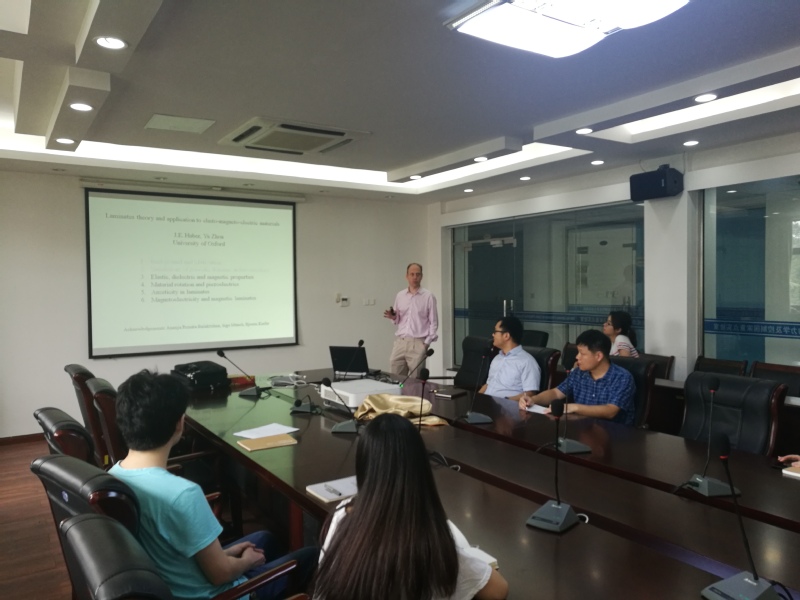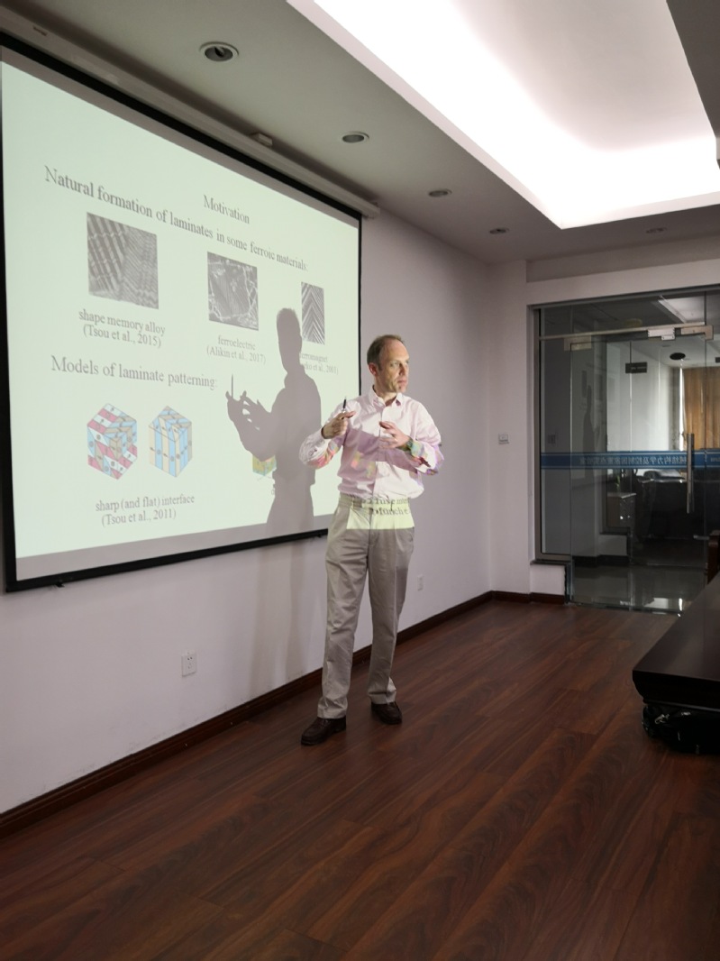 应公司航空宇航公司机械结构力学及控制国家重点实验室高存法教授的邀请,牛津大学John Huber教授于2018年9月3日至2018年9月7日访问公司,并于9月3日和9月7日分别做了题为Laminate theory and application of elasto-magneto-electric materials:Theory和Laminate theory and application of elasto-magneto-electric materials:Application的学术报告。报告从理论层面上通过讨论铁电材料中的微观结构来推动对层压板的研究,并展示了如何使用经典的均质化理论推导出层压板的线性特性,又从应用角度探讨了形成具有所需弹性或电磁耦合特性的材料的一些可能性。报告内容丰富、生动精彩,对公司相关研究有一定的借鉴作用。讲座后,Huber教授认真回答了师生的提问,并与在场听众关于科学研究和留学等话题进行了探讨和交流。师岩副研究员主持了报告。