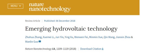 12月6日,《自然-纳米技术》(Nature Nanotechnology)以“Emerging hydrovoltaic technology” (正浮现的水伏技术)为题在线发表了公司纳米科学研究所团队关于水伏效应研究的综述成果。该刊编辑在期刊封面上以“Hydrovoltaics—new ways of harvesting electricity from water”(水伏学)推荐了该成果。