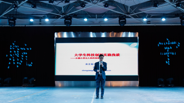 青春飞扬的舞台上,一首由航宇学子原创的航宇青年主打歌《逐梦长空》拉开了师生同乐跨年的序幕。此次梦想公开课分为“航宇青年知”、“航宇青年行”、“航宇青年梦”三个篇章,启迪着航宇新青年在新的一年中继续践行爱国、励志、求真、力行。第一篇章“航宇青年知”中,2018级入党积极分子带来朗诵《祖国颂》,抒发了航宇青年的家国情怀;合唱《我们都是航宇人》展现着航宇青年航空报国的志向和坚强不屈的意志;话剧《灰姑娘的南航奇遇记》启发同学们在大学中笑对生活起落、关注心理健康;研究生院副经理、航空宇航公司飞行器系副教授郑祥明老师则为同学们讲述科创故事,从微小型无人机的角度带来了创新与实践的精彩一课。第二篇章“航宇青年行”以团委“微心愿”活动与“绿勤行”社会实践团队的分享为开端,向同学们诉说着2018年暑期实践中的精彩故事;民族舞蹈《维吾尔风情》展现着民族大团结、共创新时代的航宇青年追求。第三篇章“航宇青年梦”中,航宇学子以引爆全场的舞蹈串烧跳出了青春梦的活力色彩与热情澎湃;话剧《月桂女神》鼓舞同学们青春逐梦最重要的是过程和体验,要不怕失败,勇敢向前;而互动合唱《We will rock you》展现出了航宇青年拼搏向上的逐梦信念,再次引发全场学子共鸣。在教师致辞环节,每位到场老师逐一向航宇青年表达了殷切嘱托与新年祝福,随后通过向同学们放飞写有新年寄语的纸飞机,将最真挚的祝福与期盼传递到同学手中,再一次将晚会推向高潮。
