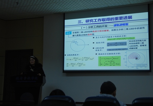 季宏丽教授作了题为“声学黑洞在结构减振降噪中的若干研究进展”的学术报告。报告介绍了针对ABH中的若干问题,提出了适用于ABH结构的多种分析方法,揭示了ABH效应的物理机制和参数影响规律,提出了多种ABH构型,提升并拓宽了ABH的波操控能力。