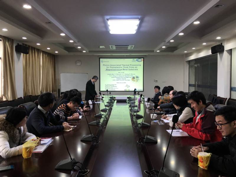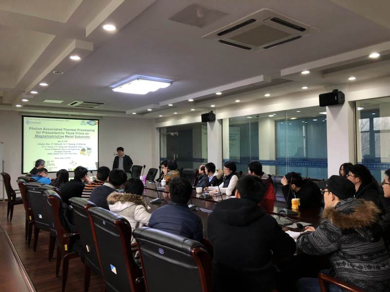 访问期间,Jungho Ryu教授和GunHwan Lee博士分别为我所师生做了题为“在磁致伸缩金属基板上生长压电厚膜的光辅助热处理工艺(Photon Associated Thermal Processing for Piezoelectric Thick Films on Magnetostrictive Metal Substrate)”和“气浮沉积技术在工业领域的应用及气浮沉积设备的设计(Industrial Applications of AD Technology & System Design)”的学术报告。报告介绍了气浮沉积技术(Aerosol Deposition或Aerosol Jet Printing),在室温和低真空环境下,利用速气流吹浮、雾化并加速超细喷涂粒子,然后高速沉积到洁净的基体表面形成涂层,该技术可在多种基材上(如玻璃、有机薄膜、金属等)生长压电材料厚膜,这种厚膜在许多领域中得到了探索性应用,特别是在MEMES器件、微型能量供给和回收器件的研发和应用中,为我所实现压电作动器件的微小型化提供了帮助。王一平教授主持了报告会,会后公司师生与Jungho Ryu教授和GunHwan Lee博士就AD技术及设备问题进行了深入讨论。