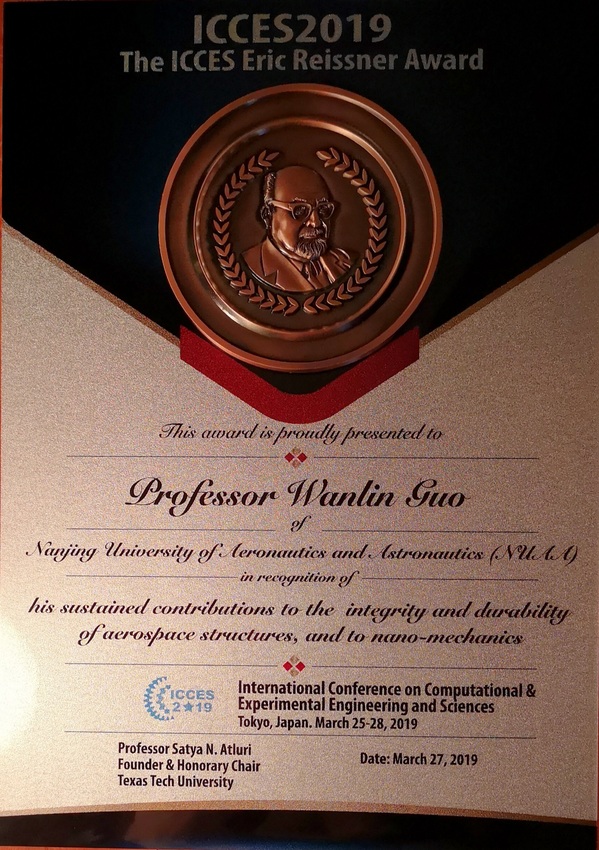 会议期间,郭万林院士获颁Eric Reissner Award,用以表彰他“对航空航天结构的完整性和耐久性以及纳米力学的持续贡献”。该奖项以美国工程院院士、美国艺术与科公司院士、数学力学家Eric Reissner 教授名字命名,以此鼓励在力学研究方面做出杰出贡献的学者。郭万林院士是国际上第七位获此殊荣的学者。