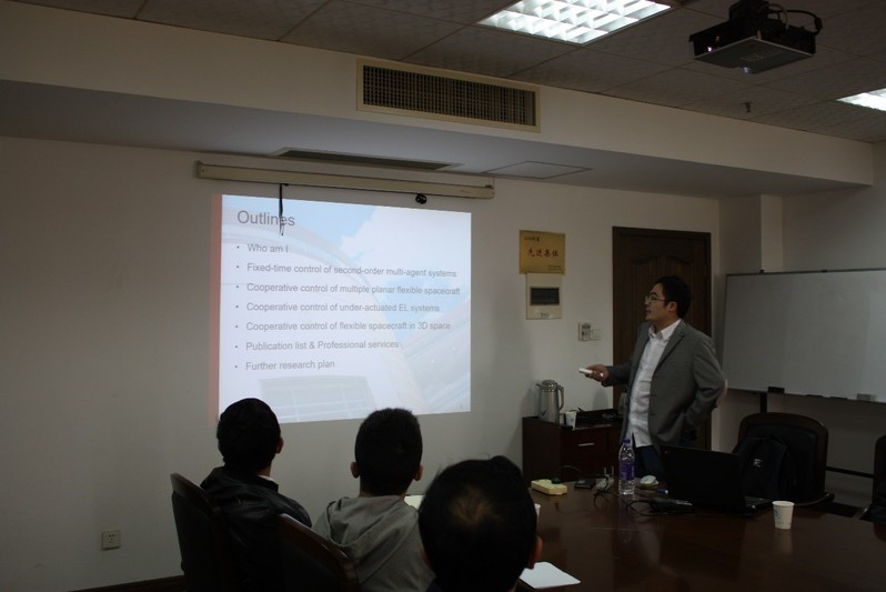 报告详细介绍了二阶多智能体系统的定时控制、多平面柔性航天器协同控制、欠驱动EL系统的分布式控制,以及柔性航天器在三维空间的协同控制。报告内容丰富,展现形式多样。报告结束后,陈提博士分享了工作期间的经验与未来的工作计划,并与公司师生就相关领域的研究进行了交流和讨论。报告会由金栋平教授主持。