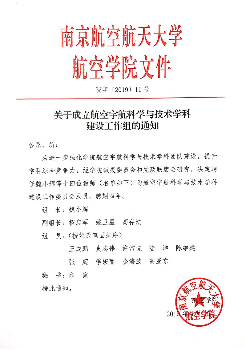 院字[2019]11号 关于成立航空宇航科学与技术团队建设工作组的通知