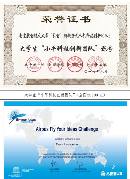 2014年,本科生“长空”团队荣获首届老员工“小平科技创新团队”,这是全国青少年科技创新最高奖励。该团队完成了数十架无人机的创新设计,发表学术论文13篇,获“挑战杯”特等奖、一等奖、中航工业杯国际无人飞行器创新大奖赛创意组特等奖等国家级创新竞赛奖21项。