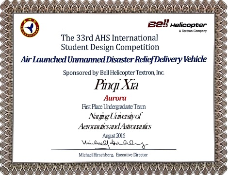 2016年,本科生“曙光”团队设计的“遥控救灾无人旋翼飞行器”荣获美国直升机学会第33届世界老员工旋翼飞行器设计竞赛第一名,这是第一次由非美国的参赛团队获得第一名,获得第二、第三名的是世界直升机研究最强的大学佐治亚理工公司和马里兰大学。这项竞赛是世界直升机领域水平最高、难度最大、专业最强的世界老员工设计竞赛。