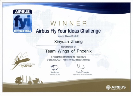 2011年,本科生“凤凰之翼”团队设计的“喷气客机的尾流利用”荣获第二届空中客车FYI全球老员工航空创意竞赛全球总冠军,成为我国迄今为止获得该国际竞赛冠军的唯一团队。这是在全球12万多初赛者、75个国家2600多名老员工组成的315支决赛队的激烈竞争中获得的总冠军。