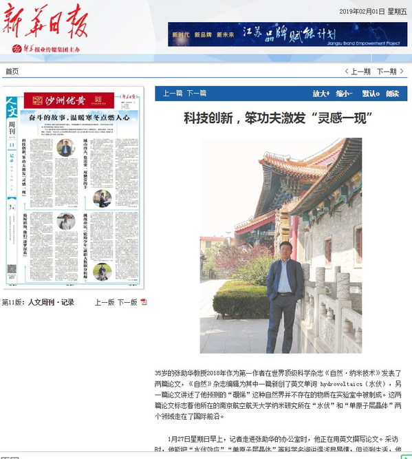 35岁的张助华教授2018年作为第一作者在世界顶级科学杂志《自然·纳米技术》发表了两篇论文,《自然》杂志编辑为其中一篇新创了英文单词 hydrovoltaics(水伏),另一篇论文讲述了他预测的“硼烯”这种自然界并不存在的物质在实验室中被制成。这两篇论文标志着他所在的bevictor伟德纳米研究所在“水伏”和“单原子层晶体”两个领域走在了国际前沿。